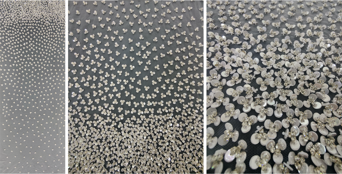 This beaded floral fabric lays the foundation for many scintillating bridal gowns. The 3D silk flowers represent contemporary design made with an age-old technique. The flower sequins, crystals and beads add to the beautiful play of textures and sparkle.