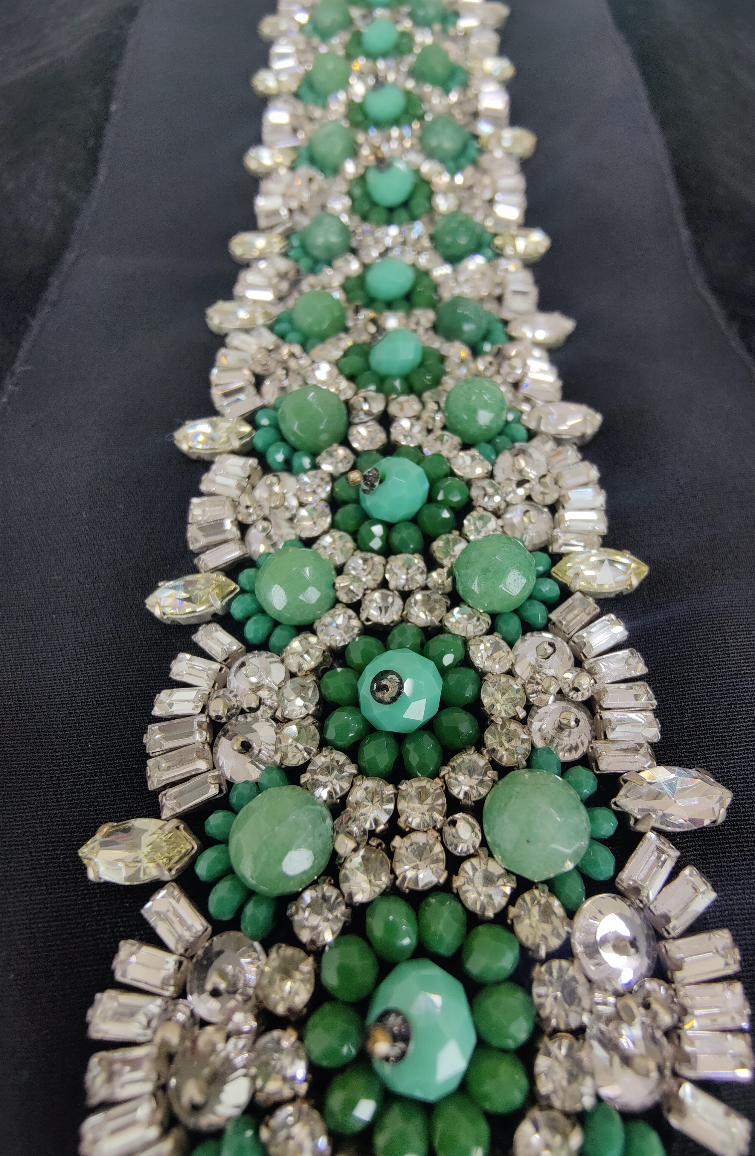 The opaque green crystal beads are sitting pretty with marquis crystals and clear rhinestones in this band that we have designed. The beauty of this design is that it can be easily customised to meet your collection’s colour palette.