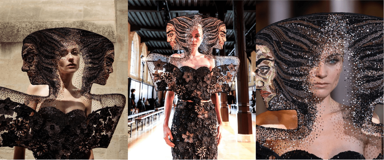 The show-stopper garments with multiple faces are supported by a meticulously welded metal frame, an amalgamation of skills (couture and sculpting) that we both admire and appreciate.