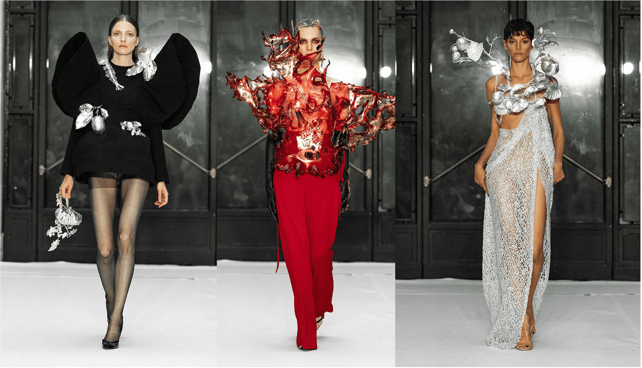 We love how the ‘fruits of sin’ are brilliantly illustrated with metal fruits, merging sculpting and couture.