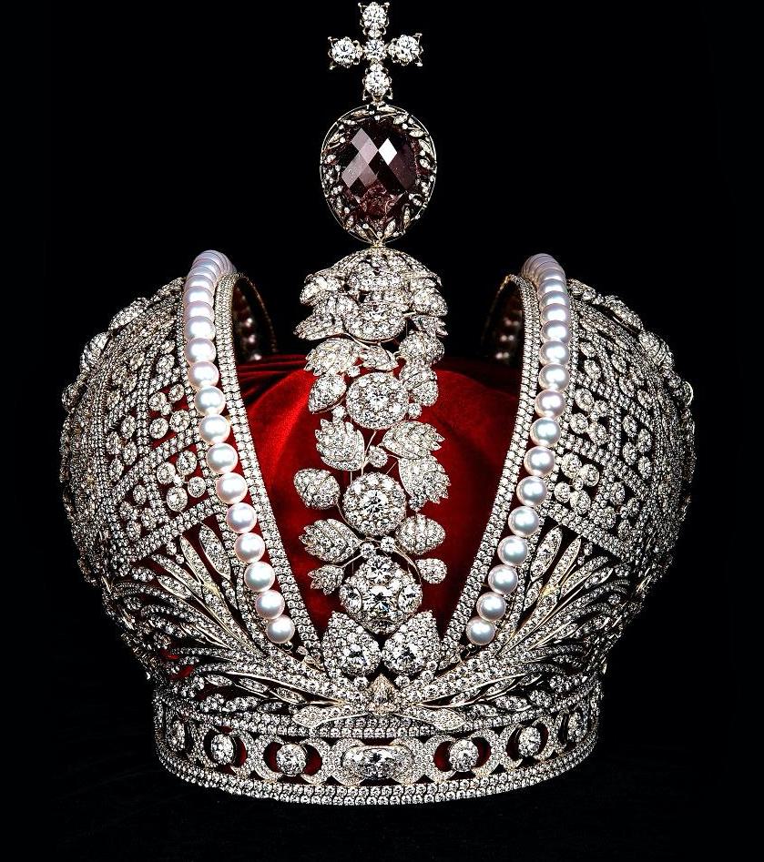 This beautiful crown is adorned with almost 5000 diamonds arranged in an intricate floral pattern that goes across the centre of the crown. We love how the diamonds are paired with pearls to create a graceful border. Right on top is a massive red spinel of approximately 400 carats; in sync with the gorgeous red inner cap.