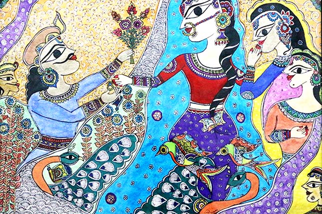 Traditional Madhubani Folk Art, which originates from the Bihar State, India. It was traditionally done on mud walls and floors. Picture Source: www.craftsvilla.com